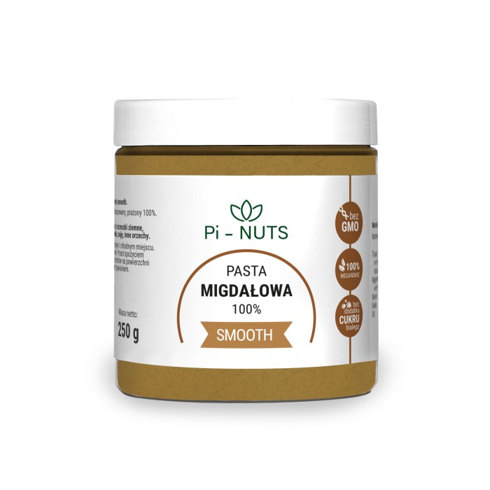 Pasta z migdałów Smooth to naturalny produkt stworzony z najwyższej jakości, starannie wyselekcjonowanych migdałów, które przeszły proces delikatnego prażenia. Jej gładka, kremowa konsystencja sprawia, że jest idealnym dodatkiem do codziennych potraw. Znakomity skład aż 100% migdałów, bez dodatków, konserwantów ani cukru, dodatkowo bogata w białko, tłuszcze nienasycone oraz witaminy i minerały.