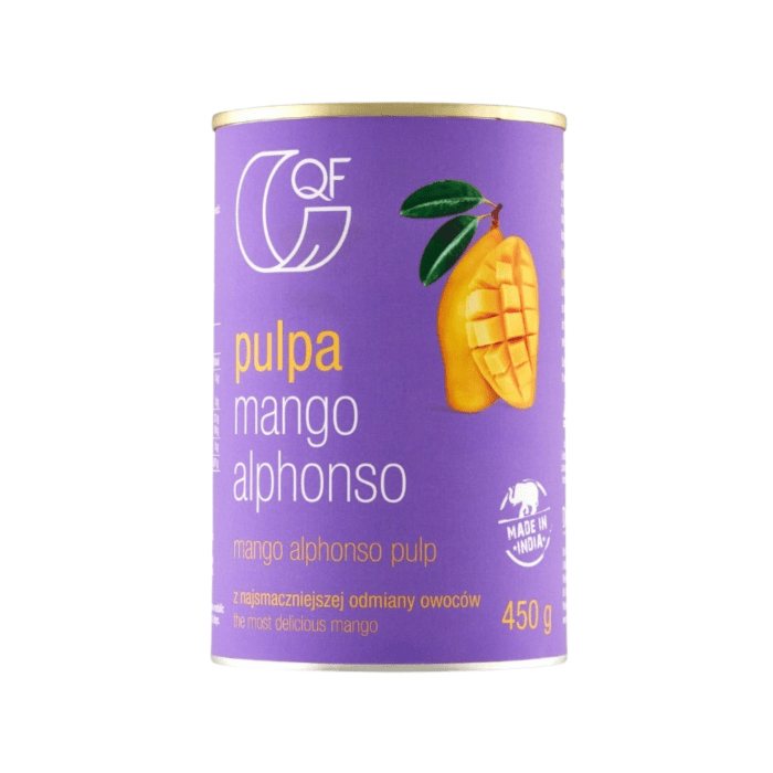 Pulpa z mango Alphonso 450 gNaturalna, gładka pulpa z dojrzałych mango to niezastąpiony składnik w deserach, smoothie, lodach, a także daniach kuchni orientalnej.